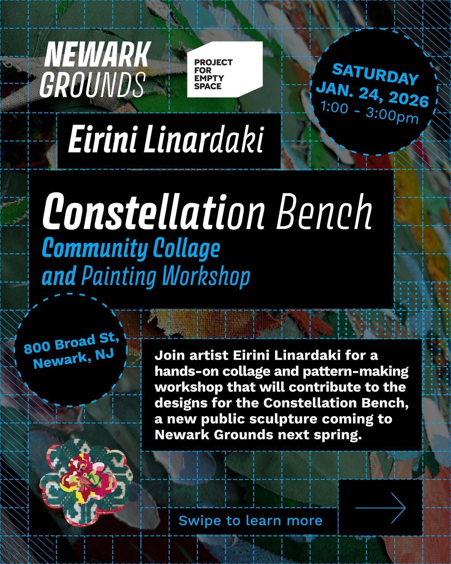Newark Grounds is kicking off the New Year with Eirini Linardaki! Build a constellation of shared memories, patterns, and connections! Join the artist on Saturday, January 24th, from 1–3 PM at Project for Empty Space – 800 Broad St., Newark, NJ for Constellation Bench: Community Collage and Painting Workshop
