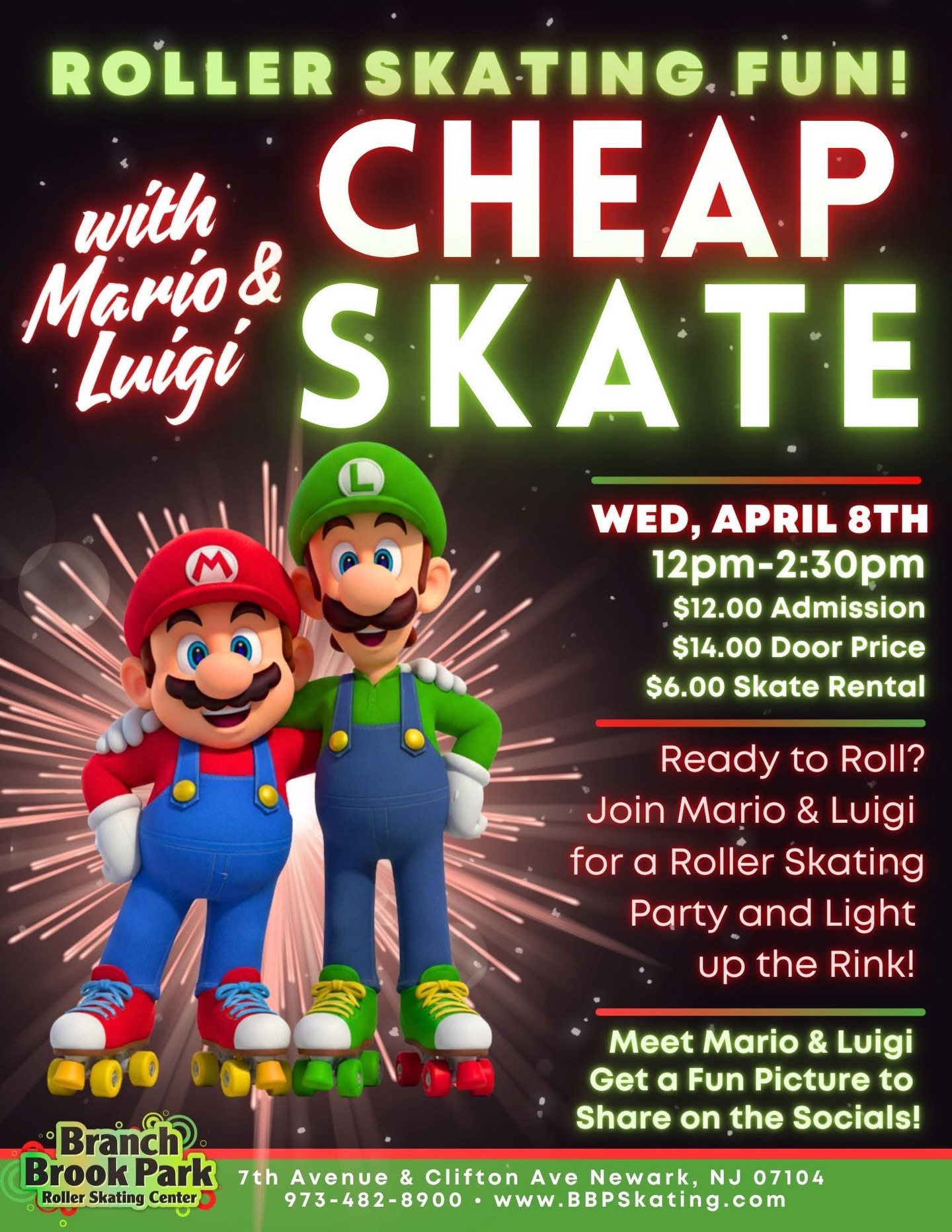 In-person Mario & Luigi Cheap Skate Branch Brook Park Skating April 8, 2026 12:00pm - 2:30pm It’s-a time to skate. Mario & Luigi Cheap Skate is here—bring your crew and let’s roll!